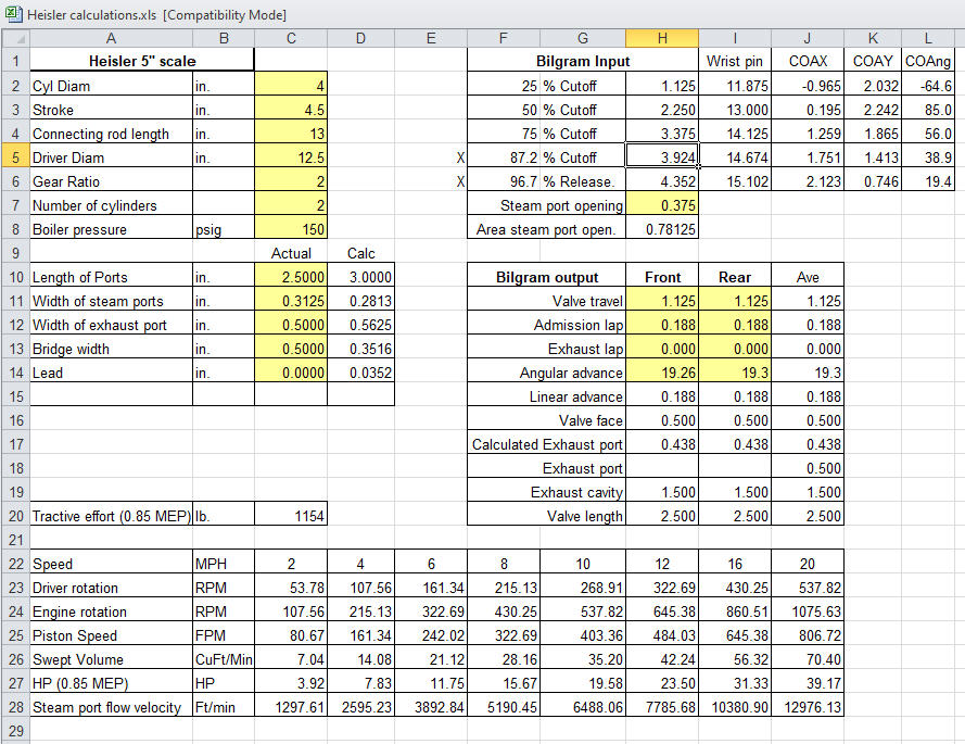 spreadsheet to calculate parameters for a steam locomotive. In this